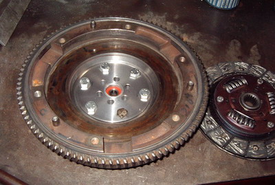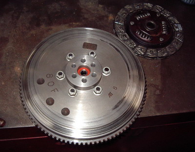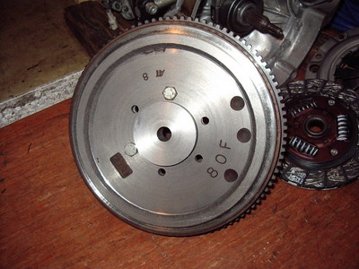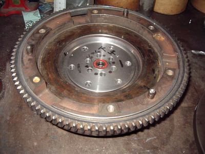 | これで完成です。前後の位置関係もほぼOKでした。左はジグに使用したGuzzi/フライホイール。 | パイロットベアリングも挿入。クロモリボルトで止めればフライホイール完成。リングギヤもGuzziのギヤを刳り貫いた物です。反対に付けられた(焼き嵌め)為、一度外し入れ替えました。ガストーチで炙れば置くだけで入る位膨張します。 |
