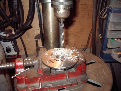 | Guzzi/フライホイールセンターにアルミで削り出したパイプをはめ込みジグにして穴位置を決め、軽く下穴をあけておきます。 | 外して万力に銜え貫通。 |