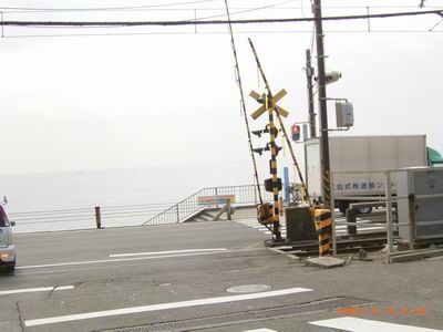 | 正面に海が見えてきました。鎌倉高校前です。よくテレビ番組、映画やCMで使われている有名な場所ですね。何時も波のサイズにドキドキする場所でしたね。 | 江ノ電の踏み切りを渡り左折して七里ガ浜へと向かいます。何時きてもいいなー!今日のサイズは膝&腰あるかないか。 |