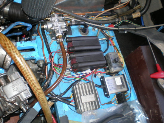 左上はデスビとダイナのピックアップ・・・これは不要になるので取り払います。デスビの後穴は、アルミ板で塞ぎます。頼めばKITに追加出来る筈・・BMは追加しました。 |