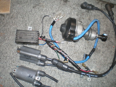 ダイナはやはり駄目でした。今度はモジュールだと思いますが・・。 前回の片肺時に、コイルはBIKE用(GPZ400)の物に交換し調子はまあまあでした・・・始めのうち。(笑) だんだんと音だけで前に行かなくなってきたのが感じられ、一瞬失火を起こしました。「これは近いうちに逝くなー」案の定でした。マフラーの出口がやけに黒いなーなんて思っていたら、原因は点火系なんでした。 左は用済みのダイナモジュール(CDI)とGPZ400コイル、デスビです。 |