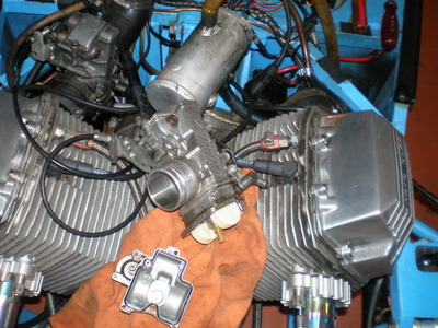 | フロート室を外し、加速ポンプをバラシ、パーツ交換です。ダイアフラムは大分痛んでいました・・・これは正解です。 | 組み立て完了してエンジン始動、オーバーフローは完治してました。やはり加速ポンプ部でした。加速ポンプが調子良すぎて(2m位は水鉄砲のように飛びます=調整式にしようか?)パカパカ踏むと良くないですね・・”じわーっ”と踏むのが正解。 |
